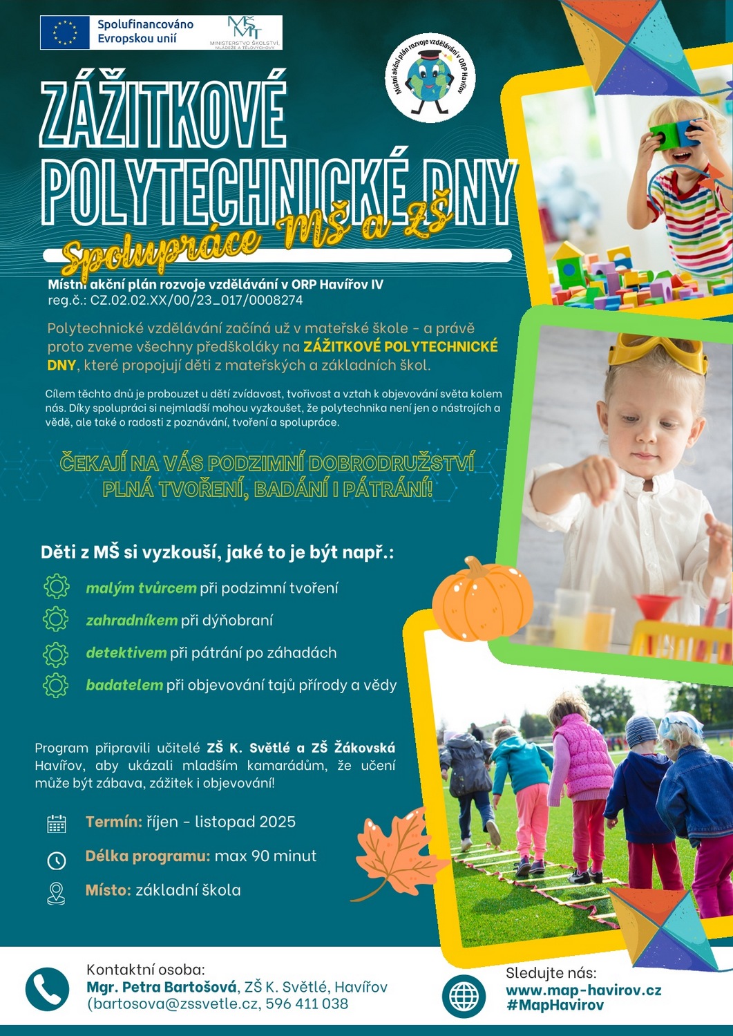 Polytechnické vzdělávání začíná už v mateřské škole – a právě proto zveme všechny předškoláky na ZÁŽITKOVÉ POLYTECHNICKÉ DNY, které propojují děti z mateřských a základních škol. Cílem těchto dnů je probouzet u dětí zvídavost, tvořivost a vztah k objevování světa kolem nás. Nejmladší si mohou vyzkoušet, že polytechnika není jen o nástrojích a vědě, ale také o radosti z poznávání, tvoření a spolupráce. Program připravili učitelé ZŠ K. Světlé a ZŠ Žákovská Havířov, aby ukázali mladším kamarádům, že učení může být zábava, zážitek i objevování!